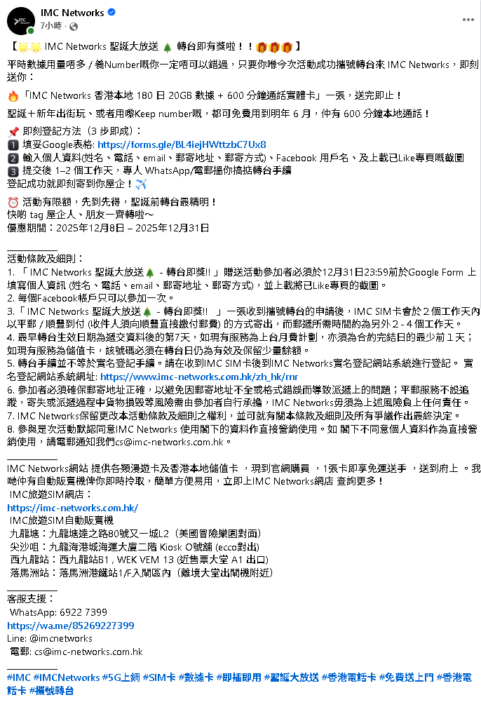 說的是 IMC Networks,呢個活動玩法直接,核心就係「轉台,送卡」。只要你喺 2025 年 12 月 8 日至 12 月 31 日期間,成功將你現有嘅手機號碼攜號轉台至 IMC Networks,就可以免費獲得一張本地實體 SIM卡。張卡嘅內容都幾實在,內含 20GB本地數據 同 600分鐘本地通話,最正係有效期長達 180日,即係差不多有半年時間任用。對於想超低成本養號碼嘅用戶來講,呢個優惠可以考慮。