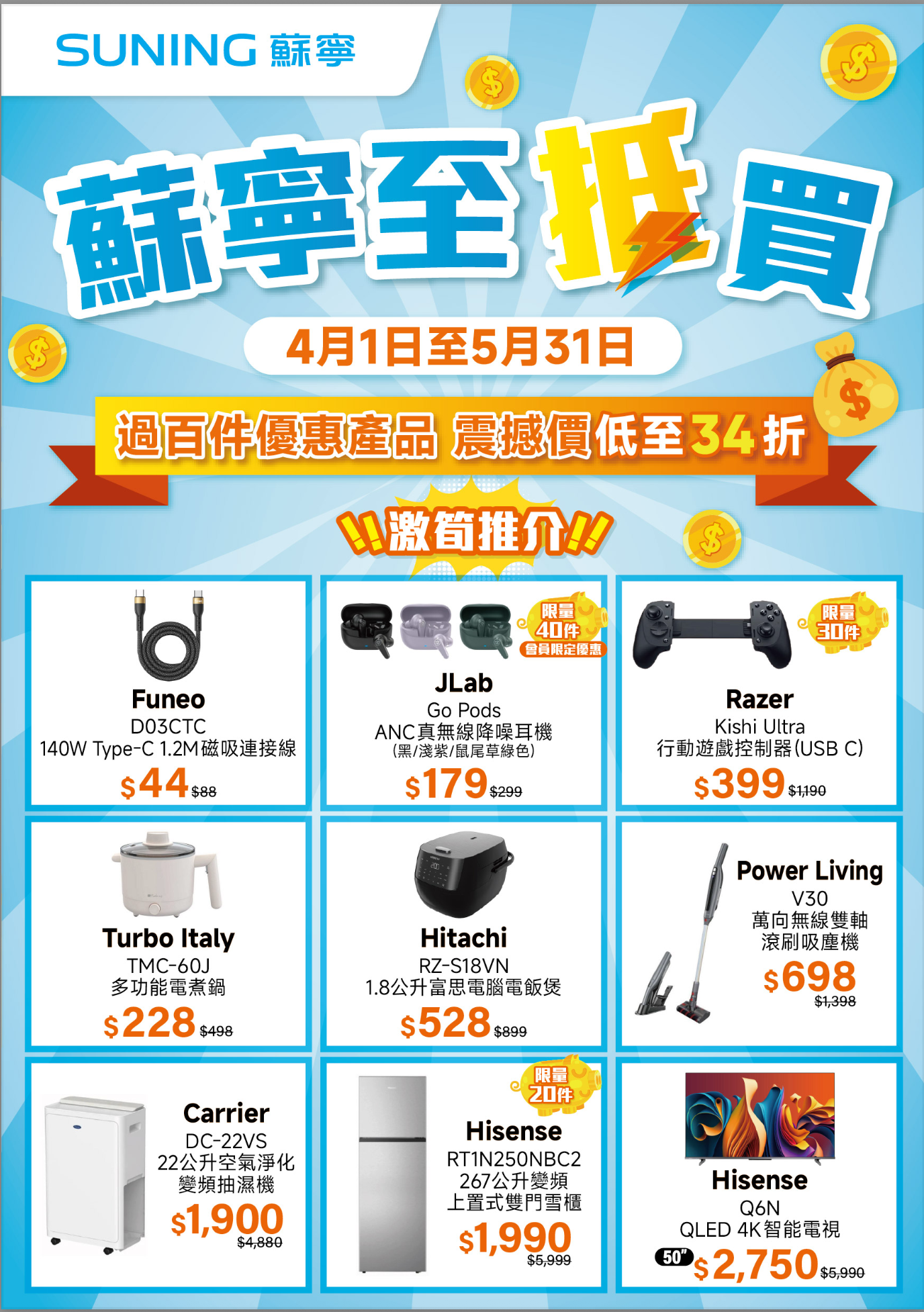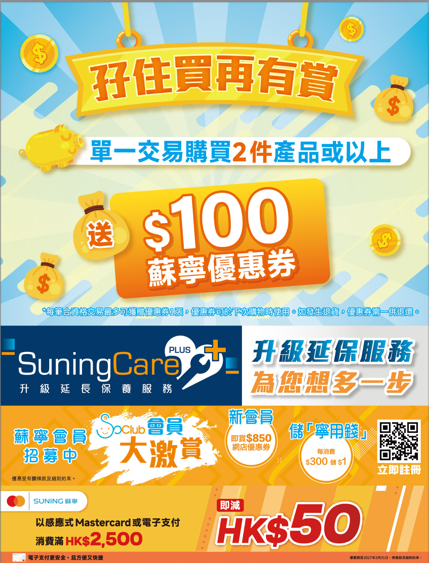 顧客於門市單一交易購買兩件產品或以上,即可獲贈 $100 蘇寧優惠券 。網店方面同樣優惠豐富,最高可享總值 $4,600 的即減折扣 。例如購買指定產品滿 $500,輸入優惠碼「APR100」即減 $100 。購買指定手機及數碼產品,或指定家電產品,亦設有不同門檻的即減優惠 。精選特價貨品及信用卡回贈