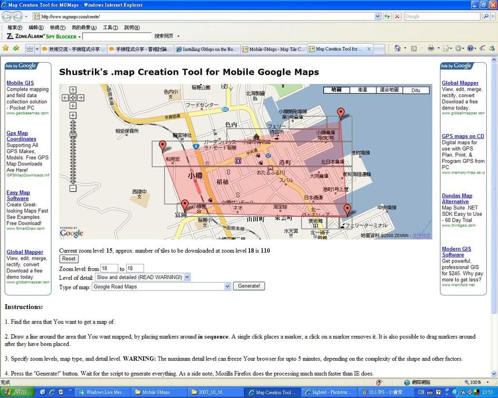 設定好所有選項後按Generate!鈕,稍等一下,就會獲得一個.map檔,假設更名儲存為Japan_Otaru.map,然後移至MapTileFE的檔案夾的話,雙擊MapTileFE後將會多了一個選項(正是所有和MapTileFE一起的.map檔名),鍵入Japan_Otaru再拍Enter,自選地圖下載正式開始:
