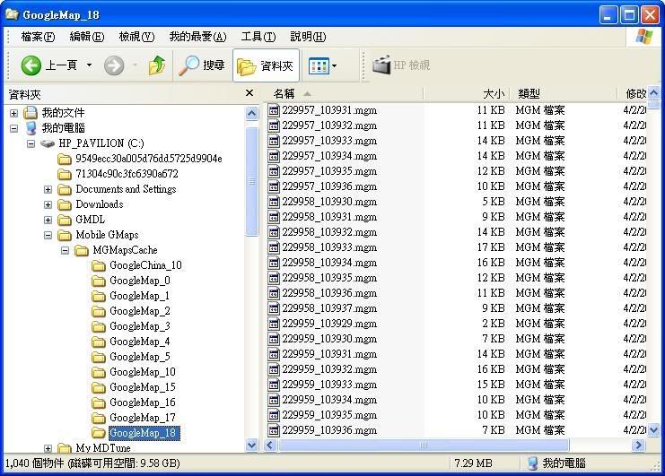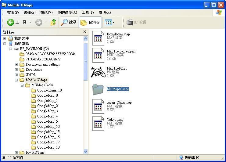 請確認檔案夾內有大量地圖檔案 (檔案名會有所不同),然後將整個MGMapsCache檔案夾 (包括在檔案夾內的cache.conf) 抄到手機記憶咭的根目錄:
