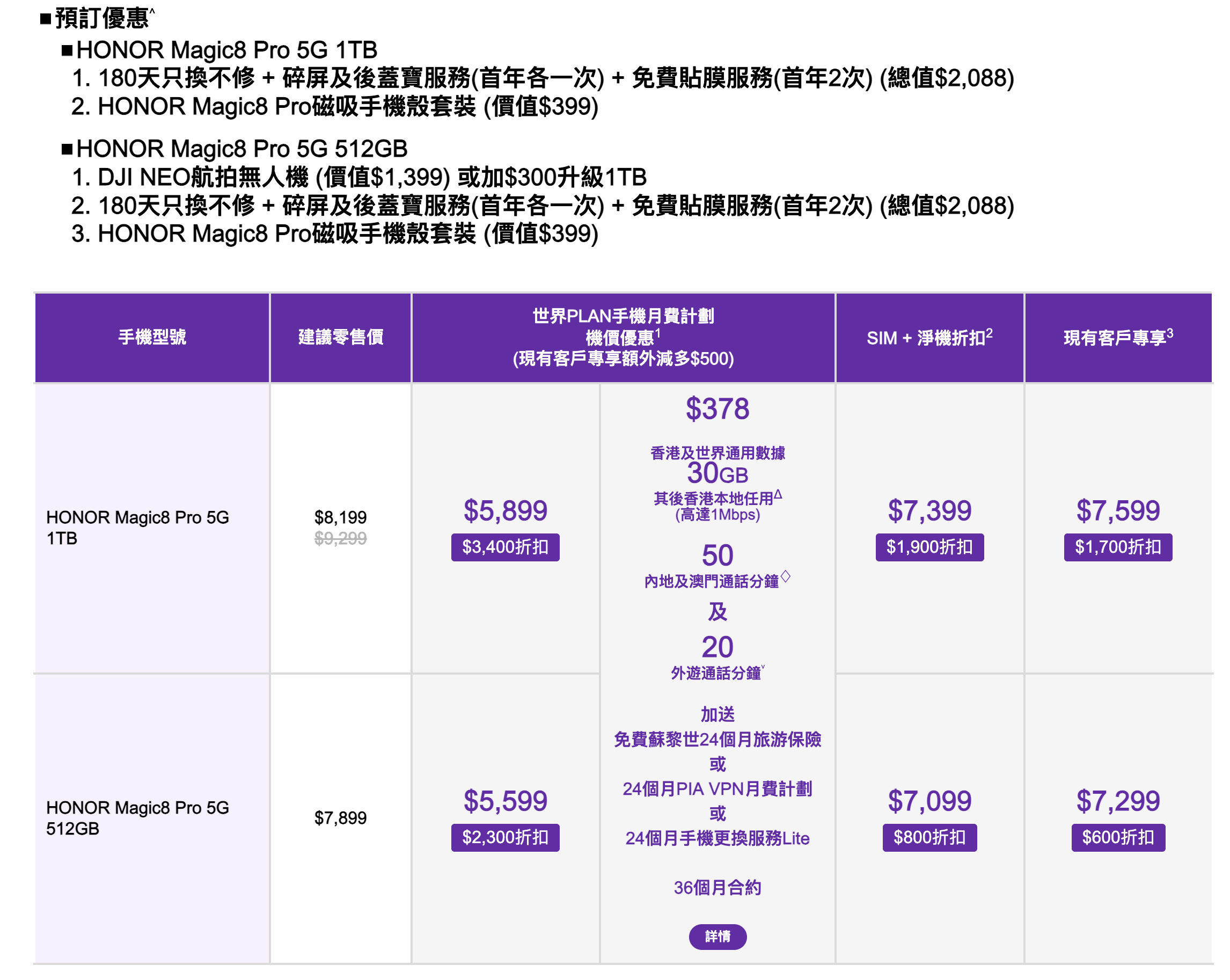 至於 Honor 官方預購禮遇,包括「180 天只換不修」、碎屏及後蓋寶(首年各一次)、兩次免費貼膜服務,以及磁吸手機殼(512GB 另可選 DJI Neo 無人機或 $300 升級 1TB)。