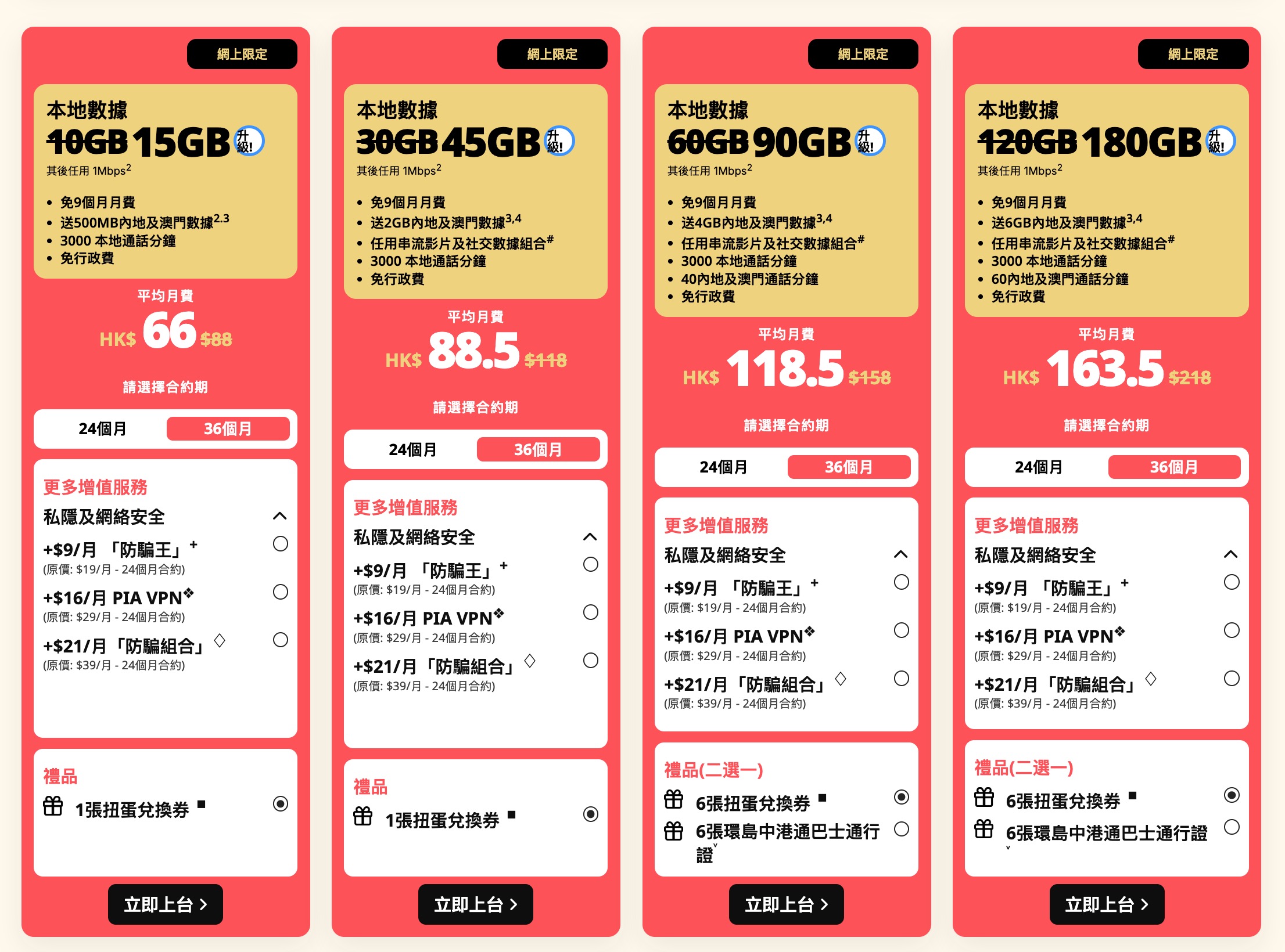 今次 3 香港旗下 MO+ 變身,全線四個計劃,都 Upgrade 去 5G 全速,所有數據用爆咗雖然都有限速,但由 4.5G 年代嘅 128kbps 變為 1Mbps,雖然無咗真無限上網選項,但都有超高用量 180GB 5G 全速計劃,不過,所有計劃,都要簽約 24 或 36 個月。分別是簽 36 個月,每月用量會更加多,最多就係 180GB。呢四個 Plan,賣點有兩個,第一,有超平計劃,本身係$88 月費,但簽 36 個月嘅話,有 9 個月免月費,平均月費會係 $66 免行政費,有 15GB 5G 全速用量。
