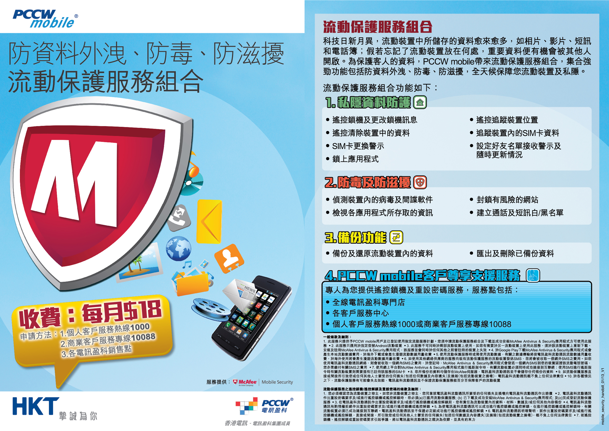 客戶只須支付月費港幣18元,便可享PCCW mobile「流動保護服務」組合^,包括: