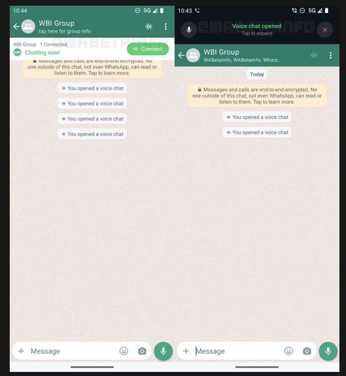 喺新版本裡面,語音聊天室是 WhatsApp Group 專用功能,Group 裡面的會員,都可以「開房」而群組會有一個新嘅語音波形圖標示喺群組聊天裡面。撳呢個圖標就會進入呢間房:語音聊天,然後會出現一個專門嘅界面。群組裡面嘅參與者可以隨時加入語音聊天開始講嘢。如果語音聊天無人,60 分鐘之後會自動結束。不過,用戶可以隨時開始另一個語音聊天。