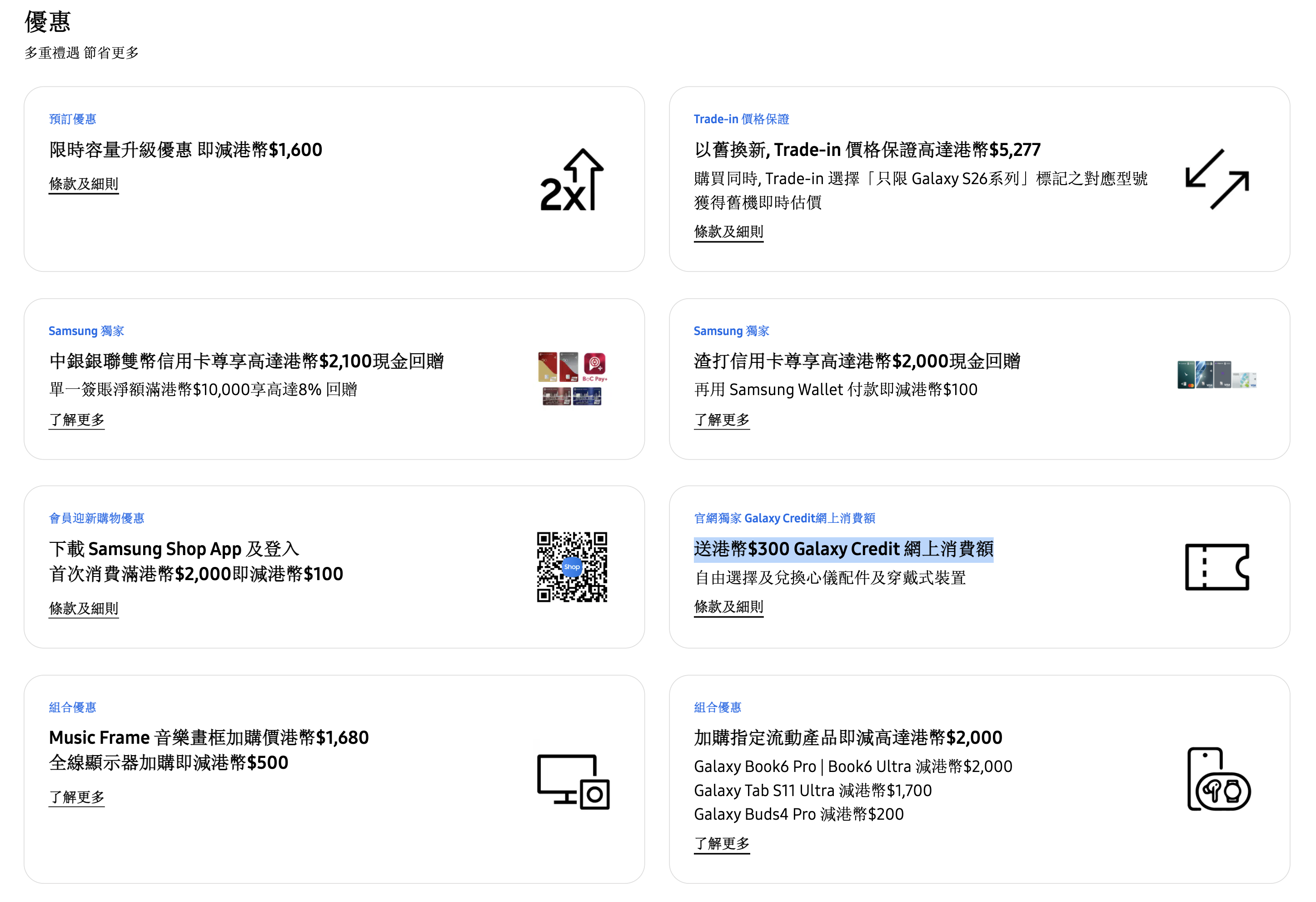 值得留意的是,豐澤網店購買 S26 Ultra,憑 Master 卡結帳,可享 $500 即減優惠;至於買 S26 / S26+,以 Master 卡結帳,可享 $300 即減優惠。另外,若以中銀信用卡於簽帳,並登記「豐澤購物激賞」及「中銀Visa信用卡狂賞派」,可賺現金回贈高達HK$1,540!按此 了解更多中銀優惠。