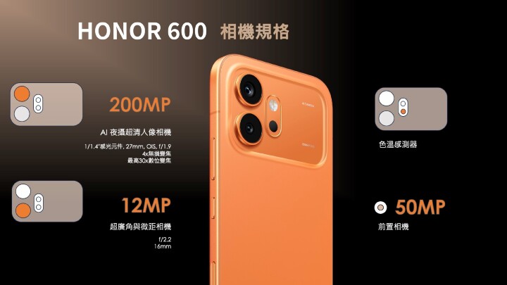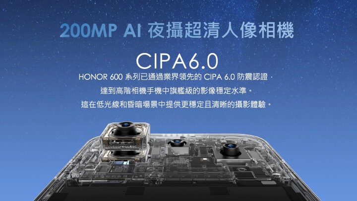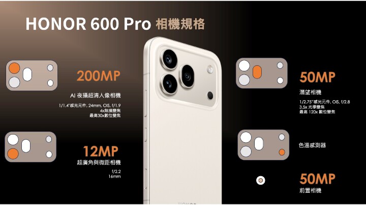 今次 HONOR 600 系列喺相機規格上面落足重本,當中 HONOR 600 及 HONOR 600 Pro 配備 200MP 超清晰 AI 主相機,採用 1/1.4 吋大型感光元件,支援 CIPA 6.0 專業級防震。其中 HONOR 600 Pro 更額外搭載 50MP 潛望望遠相機,支援 3.5 倍光學變焦同最高 120 倍數碼變焦。