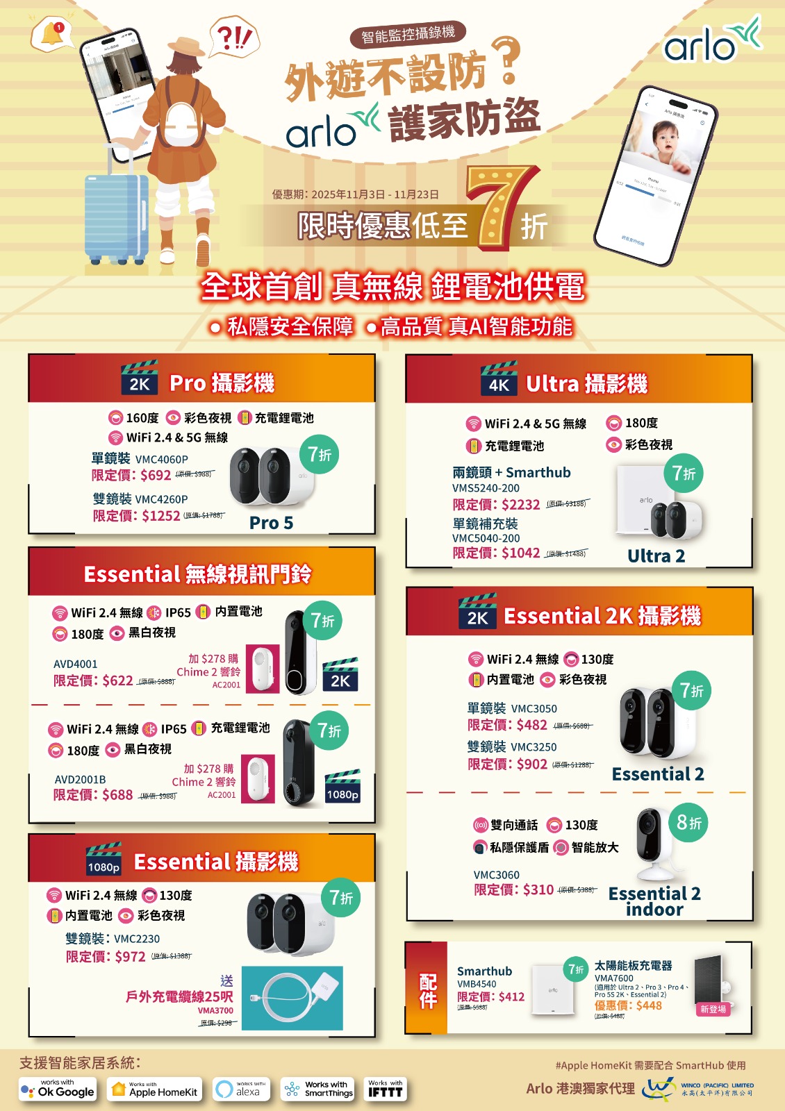Arlo Essential 第二代系列亦同步優惠。2K 無線視訊門鈴售 $622(原價 $888),戶外 2K 攝影機單鏡 $482(原價 $688),雙鏡 $902(原價 $1,288),室內 2K 攝影機則 $310(原價 $388)。Essential 攝影機提供 1080p 畫質,現售 $972(原價 $1,388)。配件如 SmartHub 及太陽能板充電器分別售 $412 及 $448。