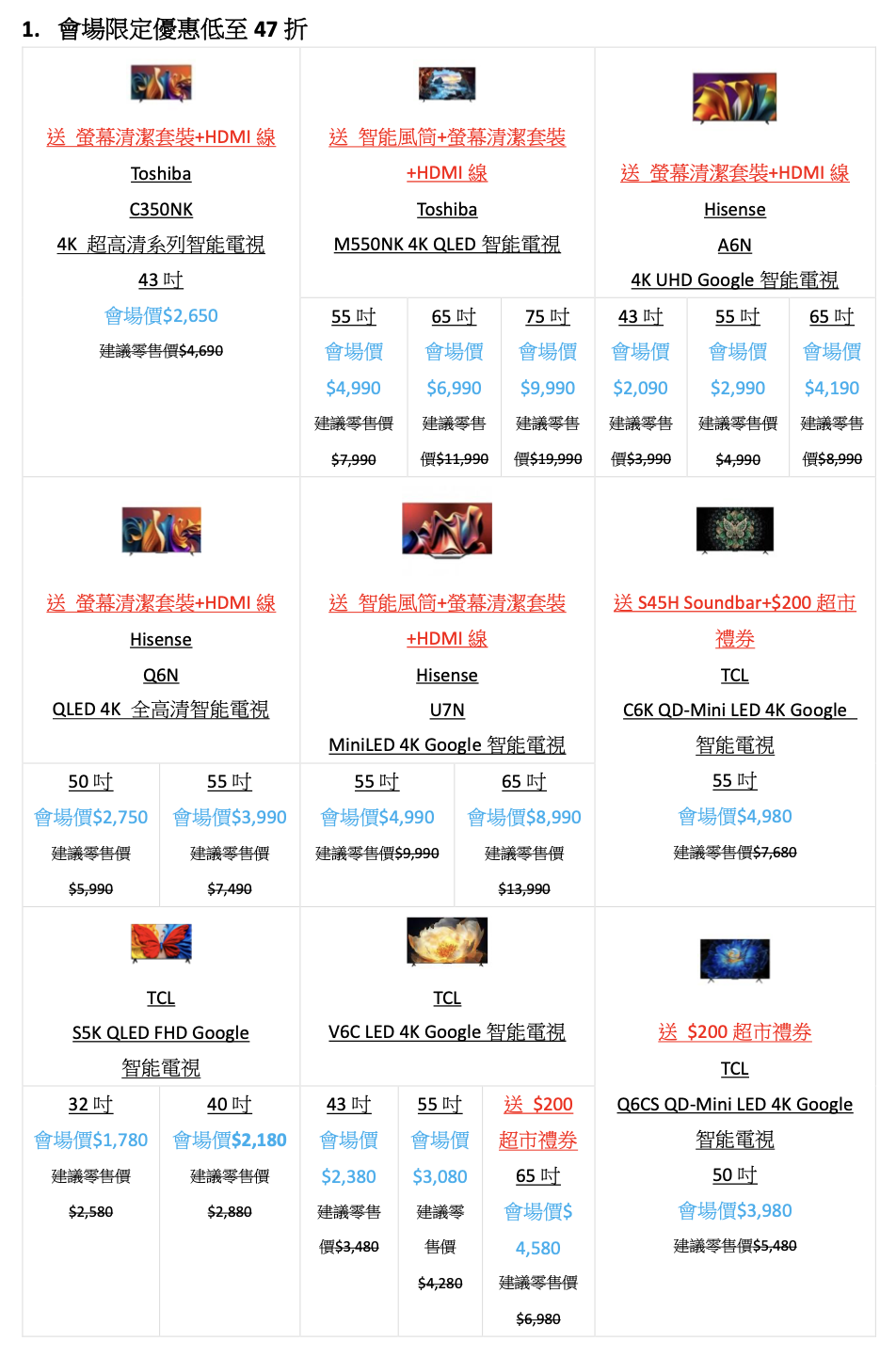 這次家電展的會場限定優惠非常吸引,精選產品折扣低至 47 折 。場內有多款超高清智能電視、雙門變頻雪櫃、抽濕機以及寵物智能家電等供大家選購 。購買指定型號產品更會送出超級市場禮券、循環扇或原廠濾網等實用贈品 。會員及信用卡專屬折上折除了貨品本身的折扣外,SoClub 會員購買家電產品滿指定金額,最高可享總額高達 $950 的電器補貼優惠。另外,如果你使用安信 WeWa 或 EarnMORE 信用卡簽帳,更可專享高達 HK$1,440 的現金回贈 。SoClub 會員專享 電器補貼高達 $950